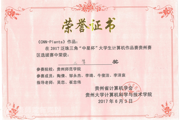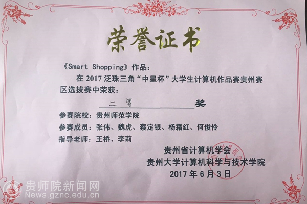 最终,best365五支参赛队伍,分别获得省二等奖两项、三等奖一项、最佳答辩奖和优秀奖两项。其中,作品“CNN-Plants”(学生:陶倩、邹永杰、李靖、牛俊杰、李泽宸,指导教师:吴恋)、“Smart Shopping”(学生:张伟、魏虎、蔡定银、杨霜红、何俊伶,指导教师:王桥、李莉)获得省二等奖,作品“云计算背景下基于反向代理的数据中心公网IP复用解决方案——反代主机管理系统”(学生:廖俊林、杨建华,指导教师:林宏)获得省三等奖,作品“智能居家监控预警系统”(学生:赵兵、夏园园、肖婷、饶钦,指导教师:吴恋、桑海伟、赵建川)获得最佳答辩奖和优秀奖,作品“面向精准扶贫对象的署类储藏监控系统”(学生:卞鲜鑫、罗锐、陈海、高望,指导教师:赵建川、桑海伟、吴恋)获得优秀奖。