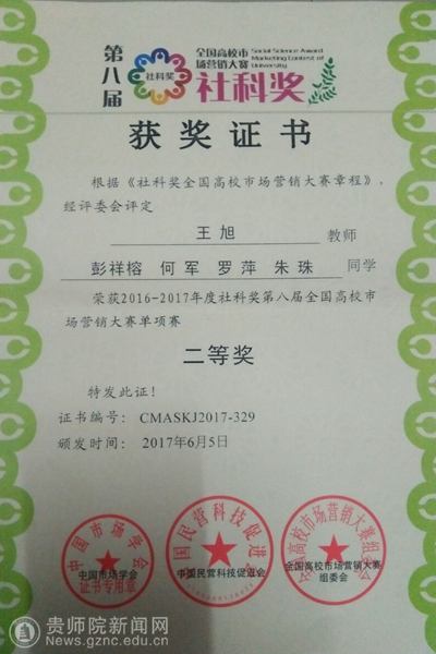 本网讯 2016-2017年度社科奖第八届全国高校市场营销大赛单项赛终于落下帷幕,该大赛由中国社会科学院财经战略研究院指导,中国市场学会主办。best365经济与政治学院教师王旭指导的奔跑野草盟和King两支团队荣获社科奖第八届全国高校市场营销大赛单项赛二等奖。