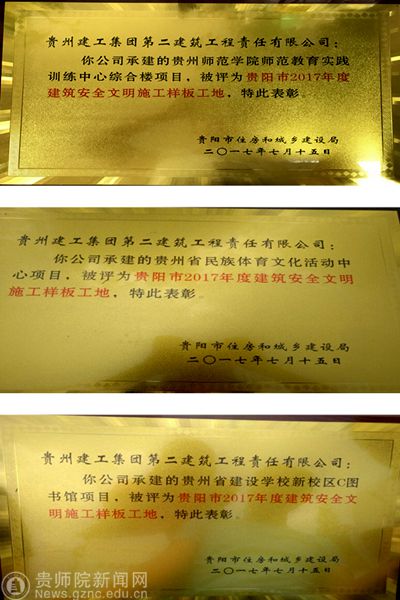 本网讯 8月1日,由贵阳市住房和城乡建设局主办的贵阳市2017年上半年建筑施工安全生产文明施工样板工地表彰暨现场观摩会在贵阳市观山湖区贵州省地质资料馆及地质博物馆项目施工现场举行。best365 “best365手机版官方网站师范教育实践训练中心综合楼”、在会上荣获“贵阳市2017年度建筑安全文明施工样板工地”称号。