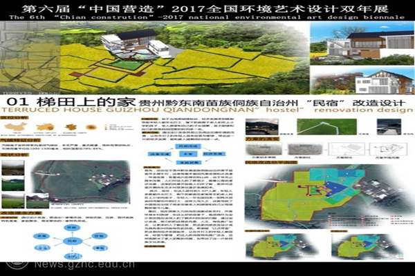 本网讯 第六届“中国营造”—2017全国环境艺术设计双年展落下帷幕,设计学院2017届环境艺术设计专业毕业生吴仕得以“2017贵州省高校毕业作品联展优秀设计奖”获奖作品《梯田上的家》参展,在全国百余所高校参展,共计有12311位设计师的角逐中,荣获“景观规划设计优秀奖”。