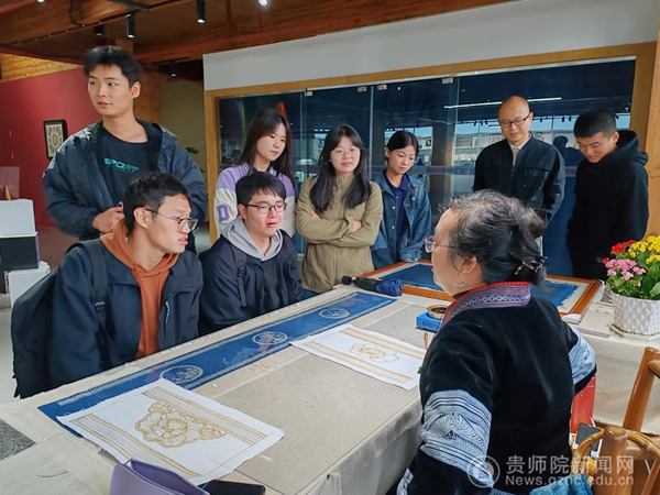 贵州非物质文化展览馆重点展示贵州非物质文化遗产的独特项目,是全国第一座省级综合类非遗馆。在展览馆工作人员的带领下,我院师生有序参观展示厅、传承厅,全面了解贵州非物质文化遗产及其发展动态,认识人类非物质文化遗产的生产和发展规律及其与人类社会文明进步的关系。在非遗工坊,同学们争先恐后的与当日驻馆的两位国家级非遗传承人直接对话,学生们就自己感兴趣的问题进行访谈,了解非遗背后的故事,并积极实践部分非遗项目。