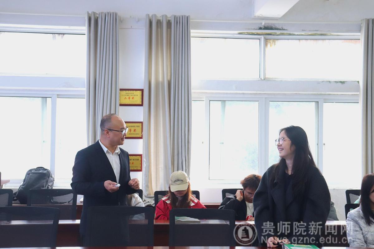 本网讯 为助力学生明晰职业发展方向,汲取从教经验,11月13日,生物科学学院特邀贵州省望谟民族中学杨超老师,于宁静楼611开展《从“迷茫”到“清晰”——分享个人的从教经历》主题学术讲座。本次讲座由学院副院长孟泽彬主持,24应生一班学生到场聆听。