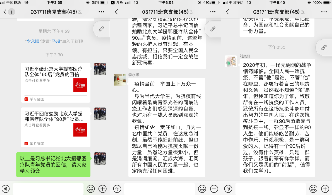 3月15日,习近平总书记给北京大学援鄂医疗队全体“90后”党员回信,向他们和奋斗在疫情防控各条战线上的广大青年,致以诚挚的问候。回信在广大青年学生,特别是党员中引起热烈反响。3月18日下午,beat365官方网站硕士031711班第一、二党支部举办了线上主题党日活动,围绕“学习习近平总书记回信精神,绽放青春绚丽之花”主题,认真学习回信精神,展开热烈讨论。