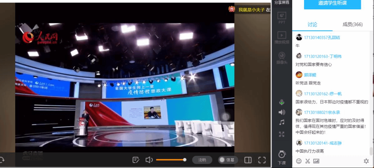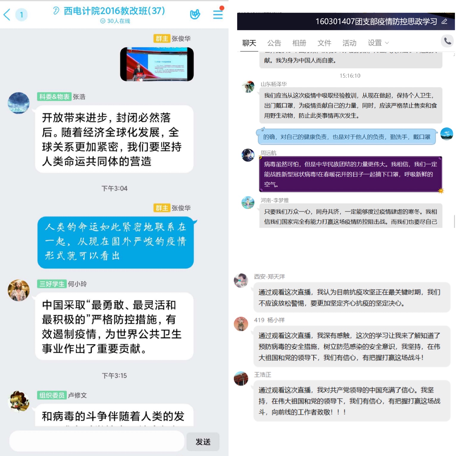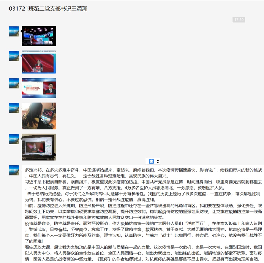 本科2016级软件工程专业学生支部组织各教学班观看了直播,并通过QQ群、微信群等展开线上讨论。辅导员艾菲结合直播课程内容及近期工作进行了专题点名,并现场连线湖北籍学生党员代表讲述抗疫故事。王淦同学说:“这次疫情事件深刻反映了我国‘集中力量办大事’的制度优势,也是中国特色社会主义制度优势的体现。”罗钊同学说:“无数医护工作者奋战在疫情前线,无数党员同志和基层干部下沉社区,还有数不清的志愿者都在为新冠肺炎疫情贡献自己的一份力。作为青年学子的我们,应该坚持全面、辩证的观点,任何时候都要居安思危,保持忧患意识,要有担当,要有责任意识。”