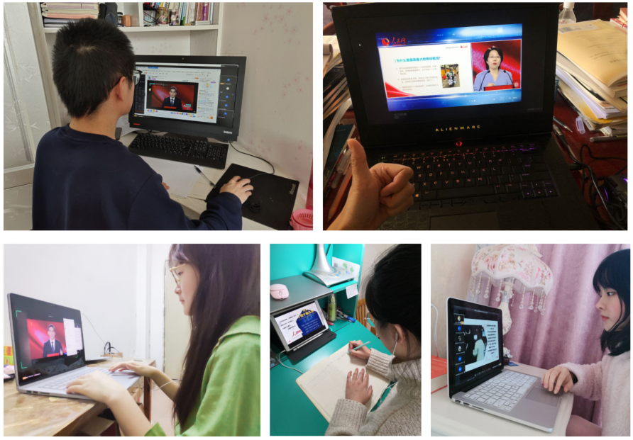 部分班级以宿舍“云”聚集的方式同上思政课。有的同学舍友之间还是寒假以来的首次见面,大家一起认真观看思政课,通过群视频互相表达了关心和问候,分享观看课程的所思所感收获,表达了对祖国的骄傲和自豪。1703013班李继霞同学感慨道:“只有国家安定才有岁月静好,这是所有人民的小确幸!我们一定要练就过硬的本领,有朝一日为国效力!”