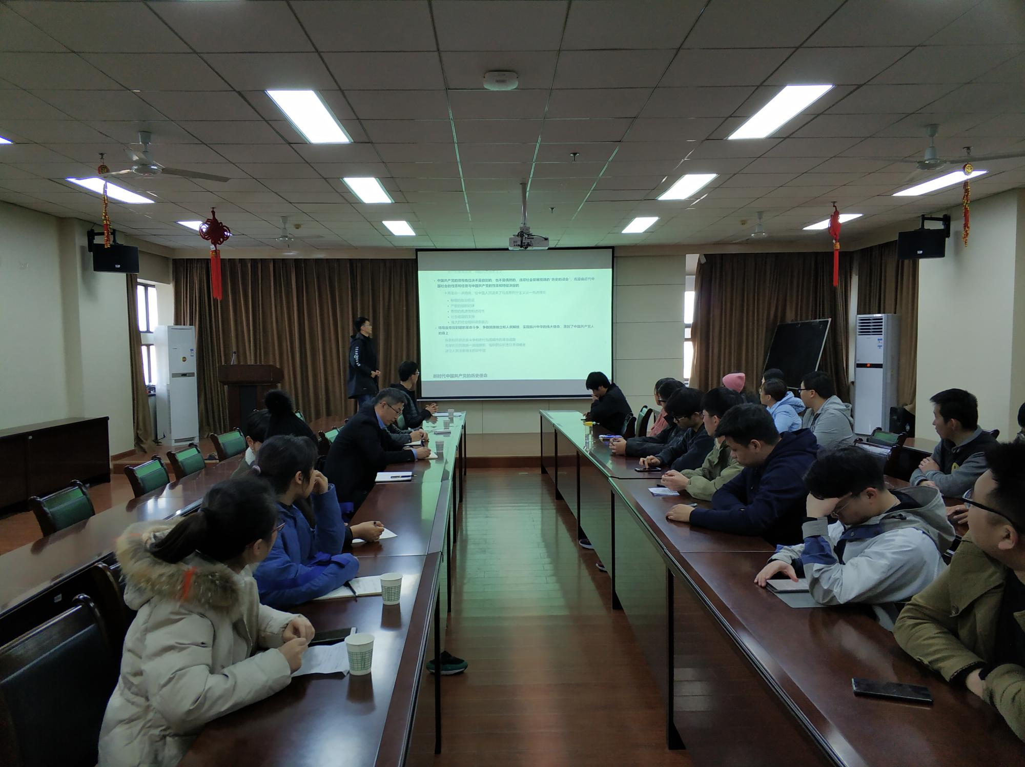 会议第一阶段,支部副书记张俊华结合《习近平关于“不忘初心、牢记使命”论述摘编》和党的历史,向大家介绍了共产党人的初心和使命。他提到“新时代要有新气象,更要有新作为”,作为学生党员要起到先锋模范作用,鼓励大家带头学习提高、服务群众、遵纪守法、弘扬正气。