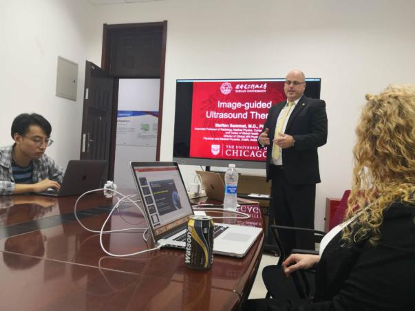 7月8日上午, Dr. Steffen Sammet教授以“Image-guided Ultrasound Therapy”为题,他的夫人Dr. Christina Sammet(美国西北大学放射科的诊断医学物理师)以“Balancing Risks in Pediatric Imaging”为题,分别为beat365官方网站研究生做了两场生动有趣的报告,对于拓展研究生的临床科研视野,开展国际合作具有非常重要的意义。