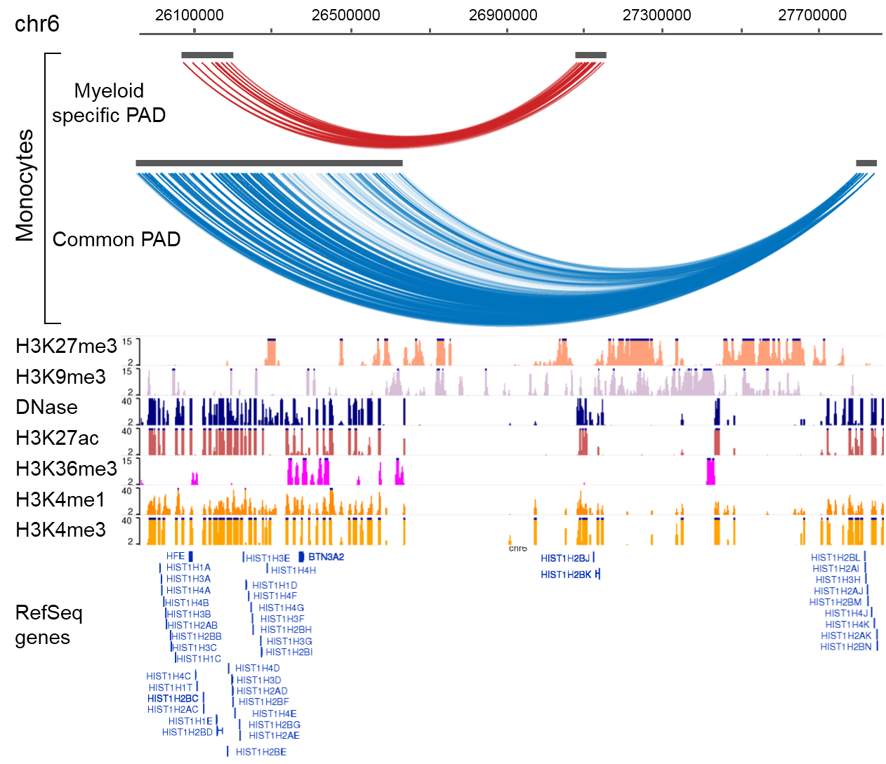 该方法被用于17个人类血液细胞promoter-capture Hi-C图谱。该研究指出PADs的类型可能通过边界区域表观因子的组合指定,并验证相似细胞之间的PADs更加保守,开创性的发现180个trans-interacting PAD。这些PADs被发现通过动态的染色质交互参与细胞特异的激活或者调控事件,为不同类型血液细胞的分析以及血液疾病的治疗提供依据。该方法同样适用从常见的Hi-C数据鉴定多尺度TADs以及PTADs,并在准确率和计算效率都表现明显的优越性。论文链接:https://academic.oup.com/nar/advance-article/doi/10.1093/nar/gkz201/5426476