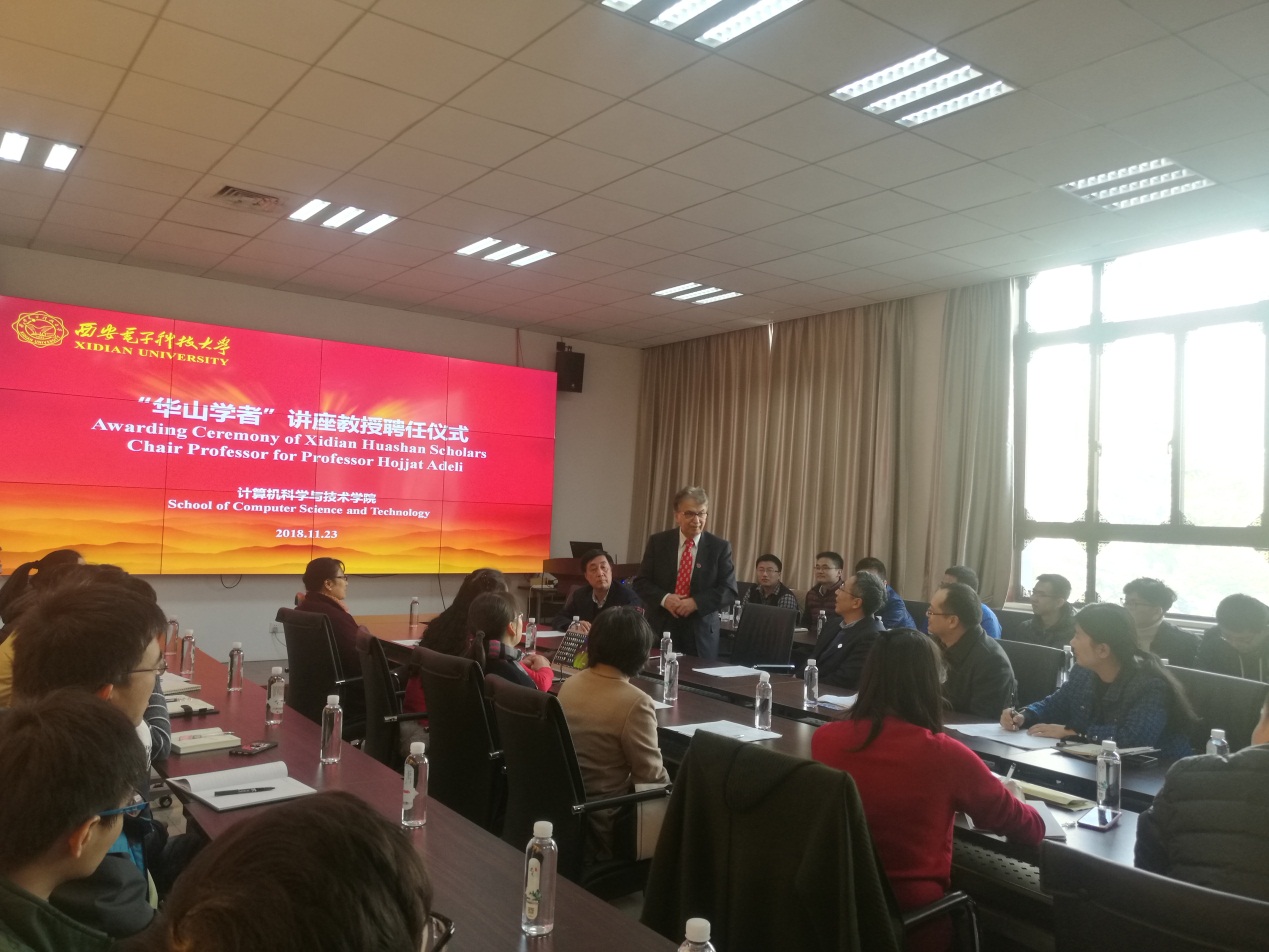 11月23日下午,Hojjat Adeli教授的“华山学者”讲座教授聘任仪式在北校区主楼Ⅱ区319报告厅举行。beat365官方网站副校长李建东教授出席聘任仪式,国际合作与交流部国际教育处副处长孔难难、beat365官方网站副院长赵韩强、王宇平教授等学院师生代表参加了聘任仪式。聘任仪式由beat365官方网站副院长赵韩强主持。