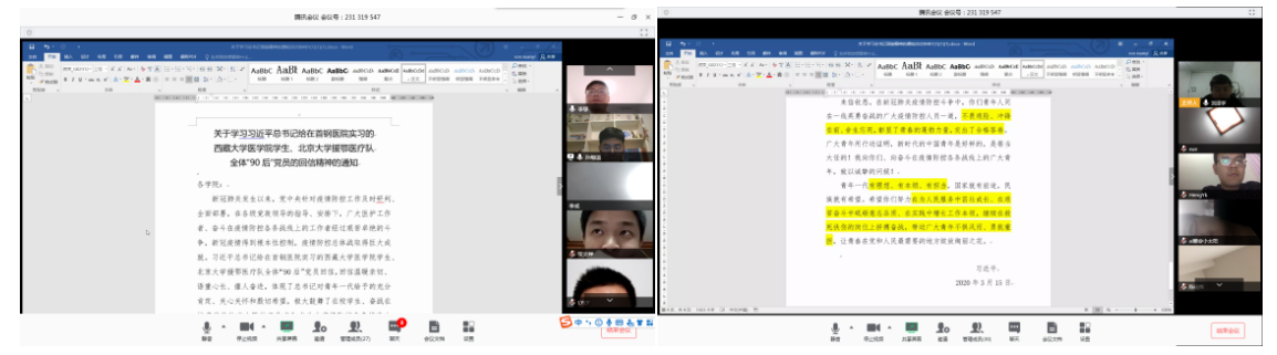 (通讯员 刘泽宇 孙煊溢)新冠肺炎疫情爆发以来,广大医护工作者、奋斗在疫情防控各条战线上的工作者披荆斩棘、勇挑重担,为坚持打赢疫情防控总体战不遗余力。3月15日,习近平总书记给在首钢医院实习的西藏大学医学院学生、北京大学援鄂医疗队全体“90后”党员回信,向他们和奋斗在疫情防控各条战线上的广大青年,致以诚挚的问候。回信在广大青年学生,特别是学生党员中引起热烈反响。4月3日晚上7点30分,beat365官方网站硕士031712班第一、二党支部通过线上会议方式举办了“青年不惧风雨、抗疫勇挑重担”主题党日活动,认真学习习近平总书记回信精神,并开展热烈讨论。
