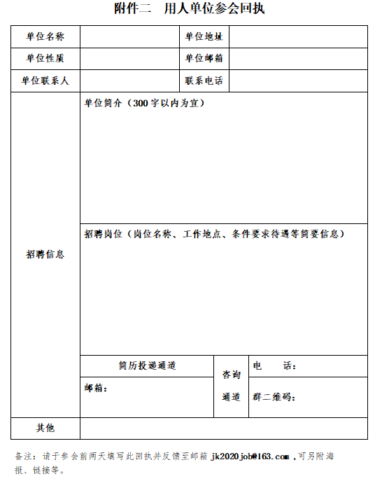 规范填写参会回执(回执具体见推送尾部附件二),包括单位简介、招聘岗位及条件、简历投递及咨询通道等,反馈至邮箱jk2020job@163.com即可报名。注:请于参会前两天填写此回执并反馈至邮箱。