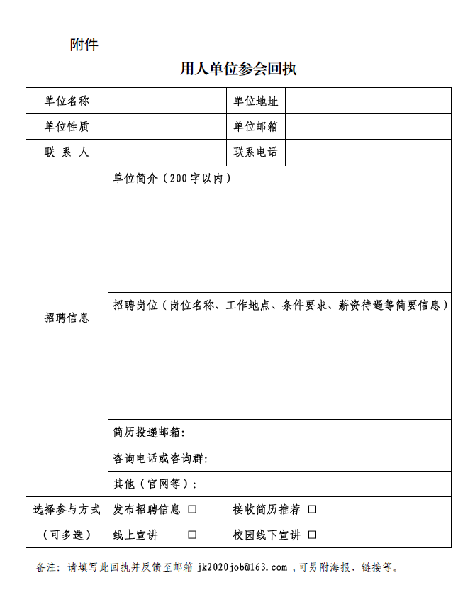 规范填写参会回执,包括单位简介、招聘岗位、简历投递及咨询通道等,反馈至邮箱jk2020job@163.com即可报名。注:请于6月15日前填写此回执并反馈至邮箱。