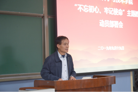 李青山作动员讲话,他谈到,学院“不忘初心、牢记使命”主题教育从9月开始,11月底基本结束,是当前和今后一个时期的一项重要政治任务。为组织开展好主题教育,9月16日学院召开两委会,传达中央、教育部党组和学校党委关于开展“不忘初心、牢记使命”主题教育的安排部署,以及学校9月12日“不忘初心、牢记使命”主题教育动员部署会精神,对学院主题教育开展进行专题研讨。9月18日学院召开党委会,讨论通过了学院“不忘初心、牢记使命”主题教育工作方案,成立了领导小组和联络小组,为启动学院主题教育进行了思想准备和组织准备。