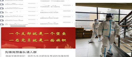 在得知学校研考工作需要大量志愿者后,支部书记杨延华报名党员先锋岗预备队,迅速投入beat365考点考生信息摸排工作,紧急与联络单上的考生一对一电话联系,询问相关情况,督促他们尽快填写考生情况摸排问卷,并与电话联系不上的考生短信联系,确保不漏一人。她在研考期间承担了学校为封控区考生专设的隔离专班的考务工作。
