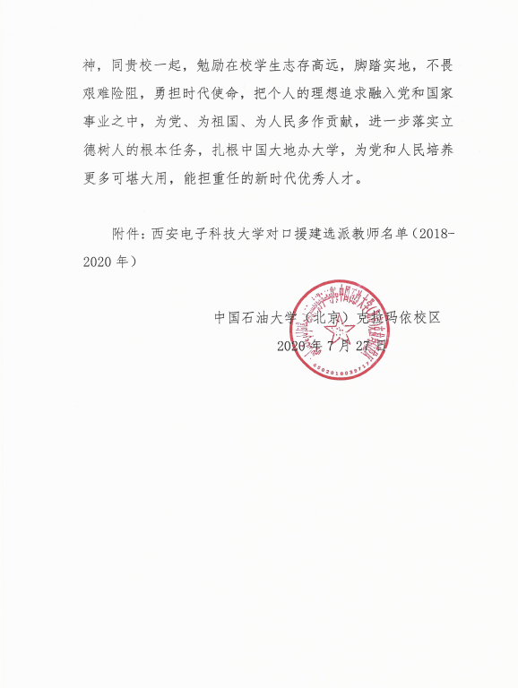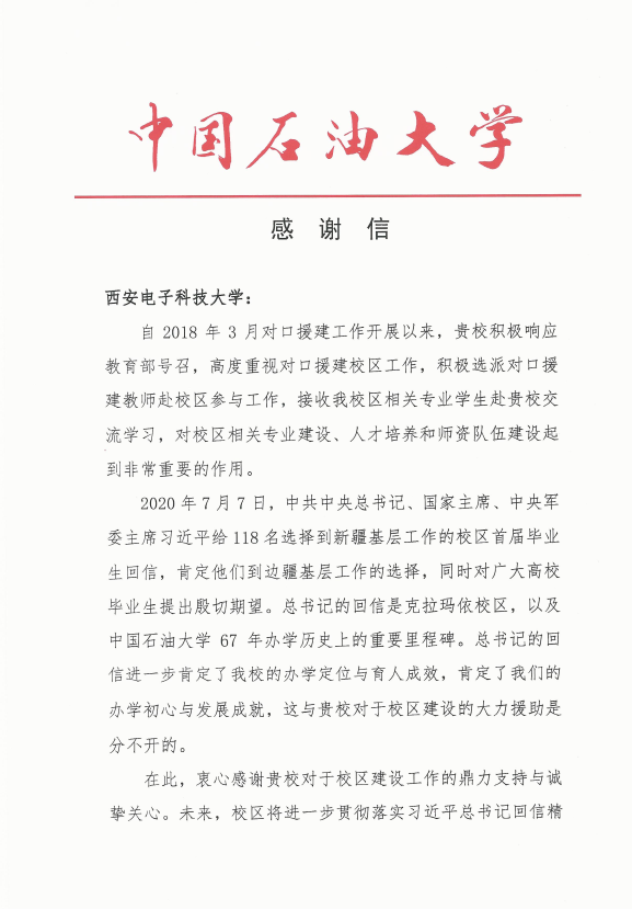 (通讯员 陈龙)为响应教育部号召,对口援建中国石油大学(北京)克拉玛依分校,2018年9月,beat365官方网站选派教学科研经验丰富的牛海军教授前往中国石油大学(北京)克拉玛依分校援建三年,牛海军教授勇于担当、甘于奉献,在援建期间,工作兢兢业业、任劳任怨、无私奉献,开展了大量卓有成效的工作,得到了学校领导、同事和学生们的认可。中国石油大学(北京)克拉玛依分校为表达感谢,专门致电学校,对beat365及牛海军教授表示感谢。