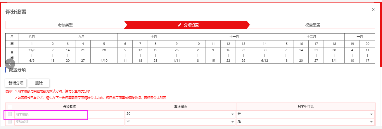 3. 成绩录入时,应先设置分项名称,再对各分项比例进行维护。维护完成后,按分项分别录入对应成绩。其中:系统默认有“期末成绩”与“实验成绩”(如下图所示),理论课程系统默认的“期末成绩”必须作为成绩的一个分项,不能另外设置期末考试,期末等其它分项替代。