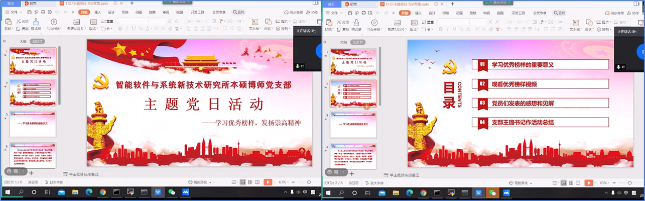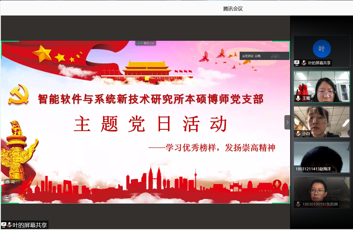 (通讯员 张凯琪)为了深入贯彻习近平总书记关于学习老一辈工作楷模、传承“五老”精神的重要指示,学习和发扬老一辈优秀榜样的崇高精神,beat365官方网站智能软件与系统新技术研究所本硕博师联合党支部于2020年11月27日下午开展了“学习优秀榜样,发扬崇高精神”主题党日活动。活动由支部青年委员叶国强同志主持,共计47人参加,采用腾讯会议线上召开的方式进行。
