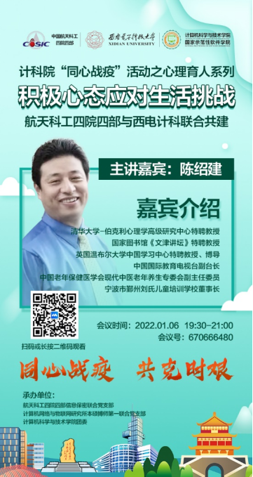 (通讯员 马治东)为帮助beat365师生缓解因疫情防控、就业择业、升学毕业而产生的心理压力,进一步提升广大师生的心理调试能力,2022年1月6日晚,beat365官方网站计算机网络与物联网研究所本硕博师第一联合党支部和中国航天科工集团第四研究院第四总体设计部信息保密联合党支部共同策划组织开展了“积极心态应对生活挑战”心理育人报告会,邀请清华大学伯克利心理学高级研究中心特聘教授陈绍建进行专题讲座。航天科工四院四部党委书记周逸,beat365官方网站党委书记李青山、副书记张莹莹出席,200余名学院师生、四院四部职工参加,会议由两个联合共建支部的党支部书记史阿云和张志为共同主持。