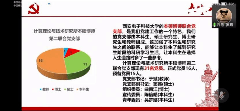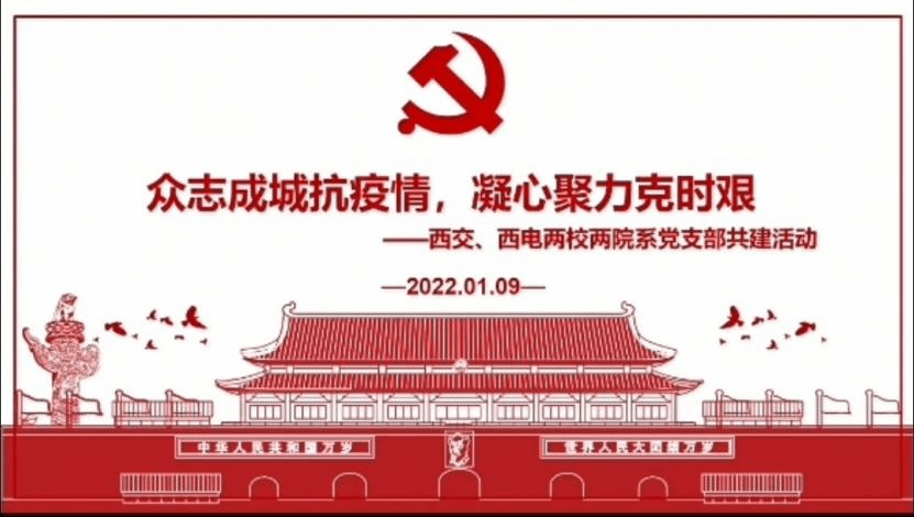 然后,西电的甘瑜嘉和西交的佘晓亮分别介绍了两校两院系党支部的抗疫工作情况。西安疫情当前,各高校均采取了严格有效的措施,西电计科院计算理论与技术研究所本硕博师第二联合党支部迅速响应学校和学院党委号召,多名支部党员、入党积极分子加入学院志愿队,担任核酸检测志愿者、出入证志愿者等,以实际行动为同学们服务。西交南洋书院师生联合第三党支部快速响应,迅速发布了有关疫情防控的倡议书,组建书院抗疫志愿先锋队,组织“出入证志愿者、食堂志愿者、核酸检测志愿者”志愿服务队,学院老师、辅导员坚守一线,积极参与,为疫情防控做出贡献!