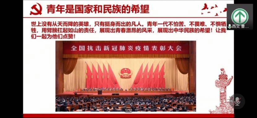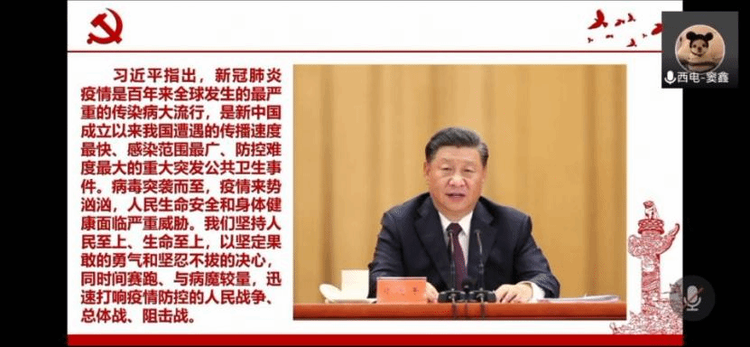 接着,西电的窦鑫与西交的曹滨龙分享了学习习近平总书记在全国抗击新冠肺炎疫情表彰大会上的重要讲话精神的体会。新冠肺炎是百年来全球发生的最严重的传染病大流行,中国抗疫斗争伟大实践再次证明,中国共产党具有无比坚强的领导力,中国人民具有不屈不挠的意志力。窦鑫谈到,青年学子在抗击疫情中发挥着关键作用,鼓励大家发挥党员带头引领作用,积极参与志愿服务;“世上没有从天而降的英雄,只有挺身而出的凡人”,曹滨龙呼吁,疫情到来时,我们要勇担责任使命,与国家与人民一起,发扬奉献精神,以实际行动传承伟大抗疫精神!