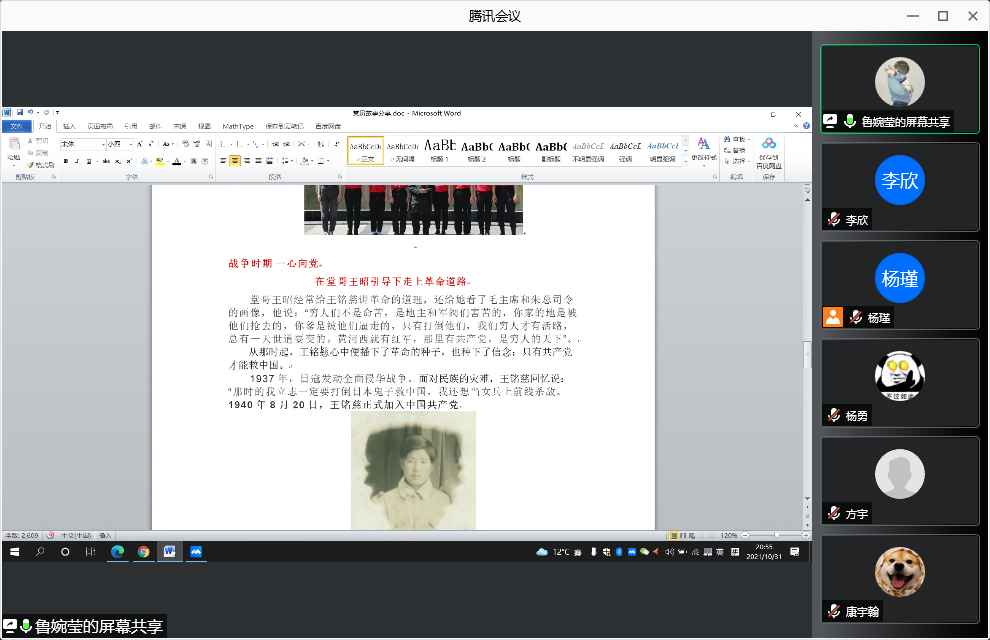 随后,支部党员同志分享了校内外优秀党员先锋模范的故事。马国臣分享了人民楷模老兵朱彦夫抗美援朝的故事,胡雅宣分享了大学生村官刘亚妮的故事,李欣分享了全国优秀共产党员王涛带领村民致富的故事,康宇翰分享了57岁洪山下沉党员肖红华的下沉故事,高向阳追忆了特级战斗英雄杨根思,方宇为大家介绍了永葆党员初心的军人张连印,支部副书记杨瑾为大家带来了冲锋在一线的反诈尖兵康飞的故事,邸维高分享了全国模范法官杨军的故事,杨勇讲述了回村当农民的开国将军—甘祖昌的故事……故事中的党员同志们在他们自己的岗位上发挥着自己的光和热,他们的精神深深的感动和激励了支部的党员同志们。