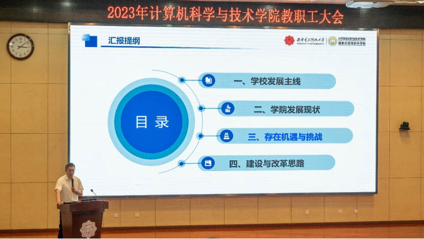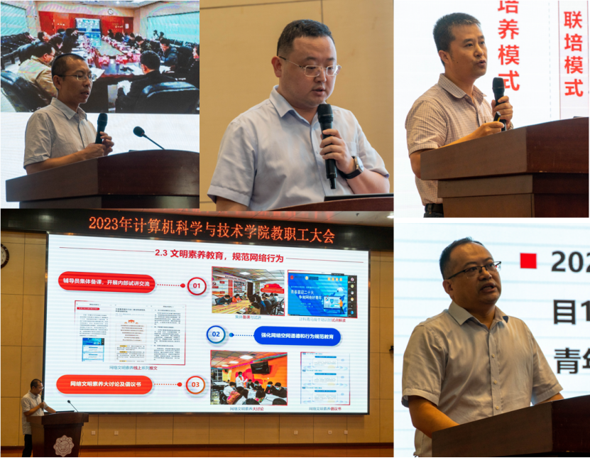 副院长万波、杨力、李瑞、赵韩强分别就学院本科教育教学、研究生教育教学、特色化示范性软件学院建设、学生工作、行政人事工作进行了汇报,并立足学院实际,总结梳理了近几年特别是2023年以来,分管工作取得的进展和存在的不足,结合主题教育的相关调研成果,围绕本科教育教学审核评估、核心课程体系建设、人才培养、特色化示范性软件学院建设与发展、学生工作、人才引进和教师培养、综合治理、安全稳定等重点工作向全体教职工汇报了工作思路和后续的工作举措。