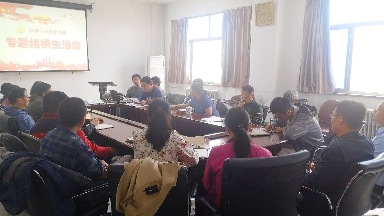 宋胜利首先介绍了软件工程系党支部专题组织生活会准备情况。第一阶段,组织全体党员集体学习,扎实做好会前准备工作。具体学习内容包括党章党规、《“不忘初心、牢记使命”主题教育最全应知应会知识》、《习近平关于全面从严治党的重要论述摘编》等材料;组织支部全体党员集体学习学校纪委办公室印发的“8∙19”案件剖析材料——《“前腐后继”的权欲悲剧》。