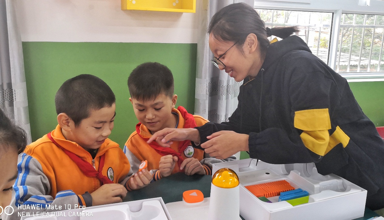 启动仪式后,科创小屋首堂科创课开讲。科创小屋配备了3D打印机、机器战车、无人机等最新的科创课程教具。小学生们首次接触MATA机器人,在科创导师和大学生支教志愿者的指导下,通过简单编程使机器人播放音乐。当机器人成功播放出《我和我的祖国》熟悉的旋律,同学们发出阵阵惊叹。课间西电师生与小学生们积极互动,同学们对科创小屋和高科技的教具充满新奇,提问异常活跃、热情高涨。随后,大学生们还给高年级班级带来了采用基于程小奔教育机器人的模块化编程等精彩内容。