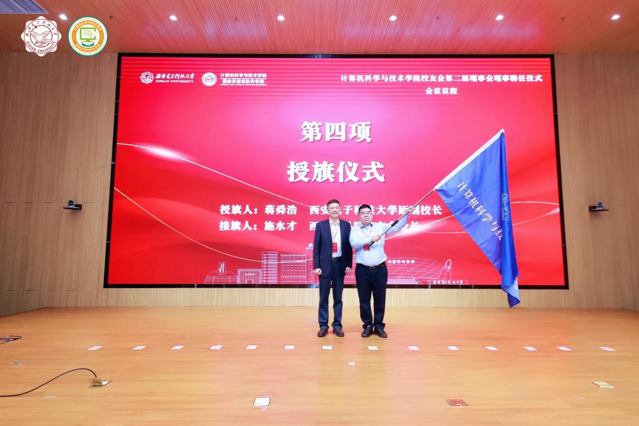 校友事务与对外合作处副处长蒋昙飞代表校友总会宣读了批复文件,原副校长蒋舜浩为新任会长施水才授旗,与会领导为第二届理事会会长、顾问代表、副会长代表、理事代表、执行秘书长、副秘书长代表等颁发聘书。