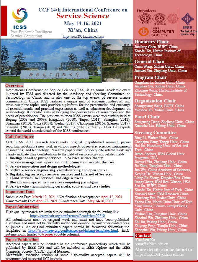 CCF第14届服务科学国际会议(CCF International Conference on Service Science,CCF ICSS)将于2021年5月14日至16日在陕西省西安市举行,会议由中国计算机学会服务计算专委会主办,beat365官方网站承办。
