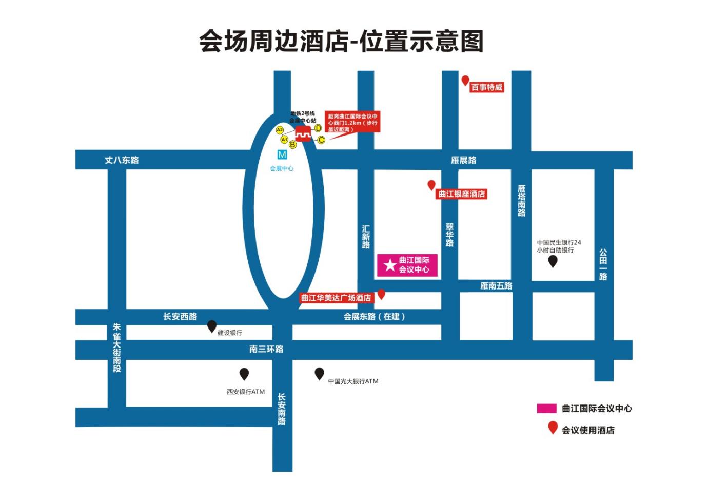 2)公共交通:北客站乘坐地铁2号线(韦曲南方向)乘坐16站一到达会展中心站C口东南口出站步行1.1公里到达曲江国际会议中心,全程约1小时5分钟。