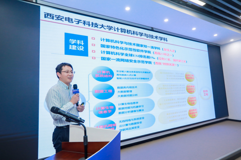 随后,沈玉龙教授与参会企业共同分享了《计算机技术前沿发展趋势》主题报告,并进行了开放应用场景的“揭榜挂帅”,从计算机科学与技术和软件工程两大学科,详细讲解了西电beat365官方网站科学研究内容和技术应用场景。