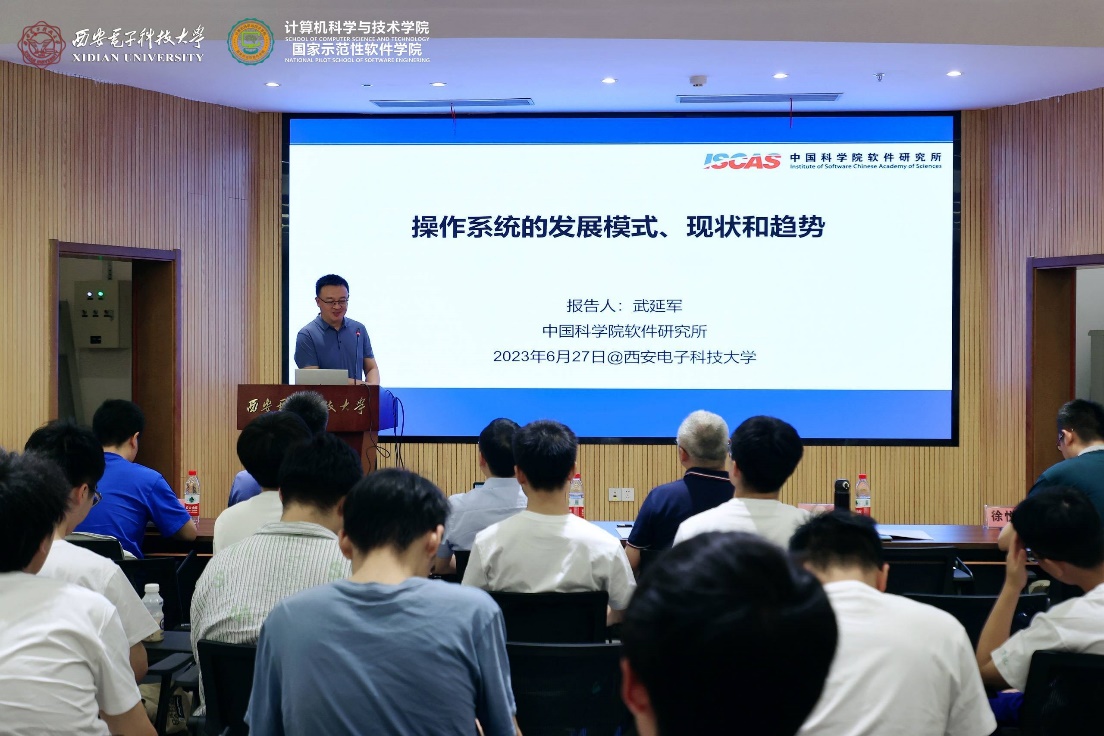 随后,在beat365官方网站南校区会议中心101会议室成功举行了“聚焦基础软件 拥抱开源生态”的学术报告,李青山教授主持学术报告会并致欢迎词,热烈欢迎陈海波教授、武延军研究员的到访,并表示陈海波教授、武延军研究员是国产开源基础软件领域的知名学者,做出了一系列创新的学术成果,也领导着有影响力的科研团队,学院的各位青年教师和同学要珍惜这次交流的机会,虚心向陈海波教授、武延军研究员学习。