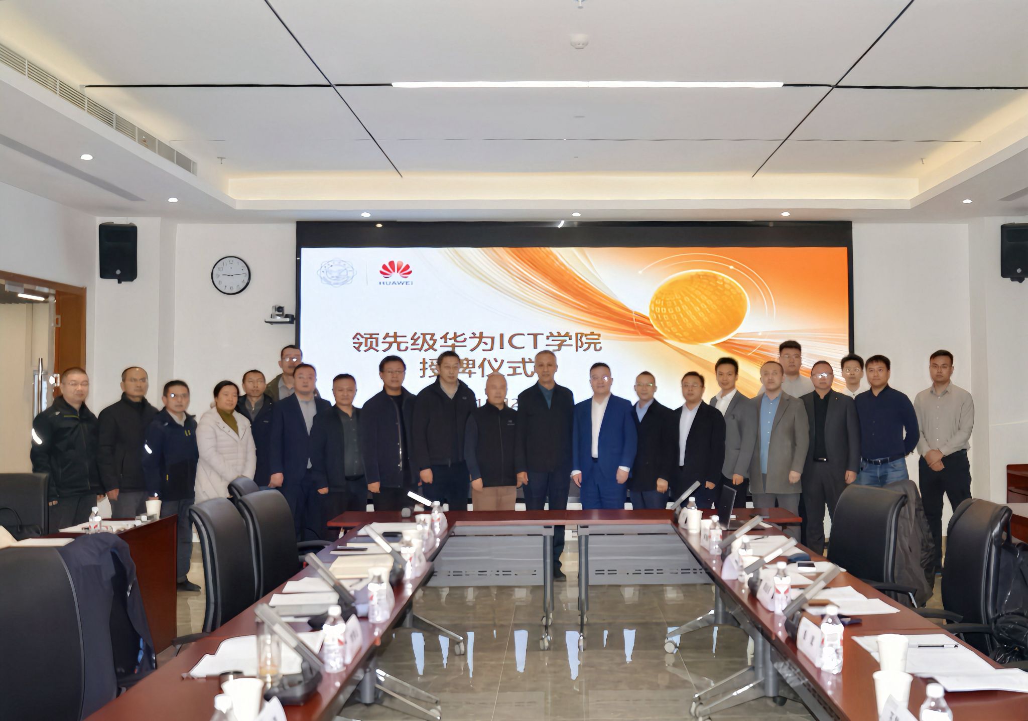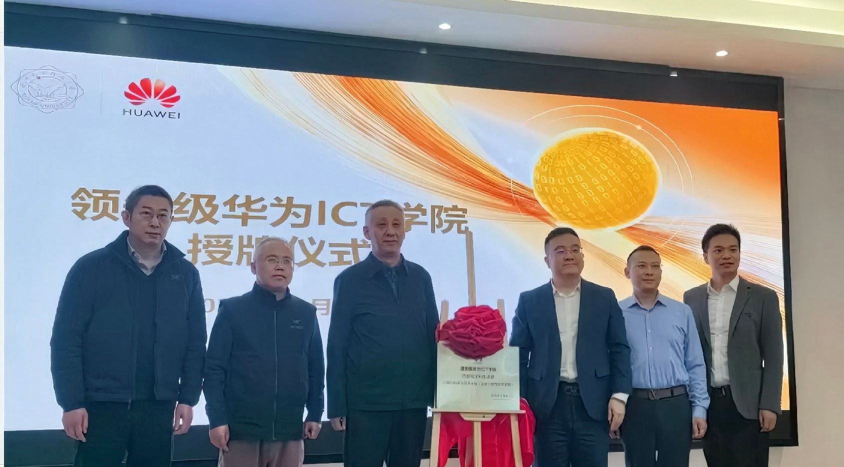 会上,王泉、李青山、崔江涛与华为郭金亮、彭军、魏彪共同为beat365官方网站“领先级华为ICT学院”授牌。