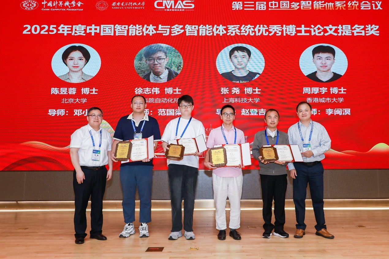 最后颁发中国智能体与多智能体系统优秀博士论文提名奖(2025),获奖人员包括北京大学陈昱蓉博士、中国科学院自动化所徐志伟博士、上海科技大学张尧博士、香港城市大学周厚宇博士。