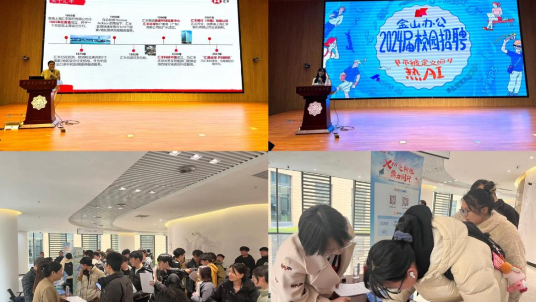 专题周点名现场搭起就业推荐平台,邀请了汇丰科技中国、金山办公、鼎信通讯、华讯网络四家企业作宣讲和现场招聘。会后全体参会学生,前往招聘咨询工作台与企业热情交流,投递简历,取得良好效果。
